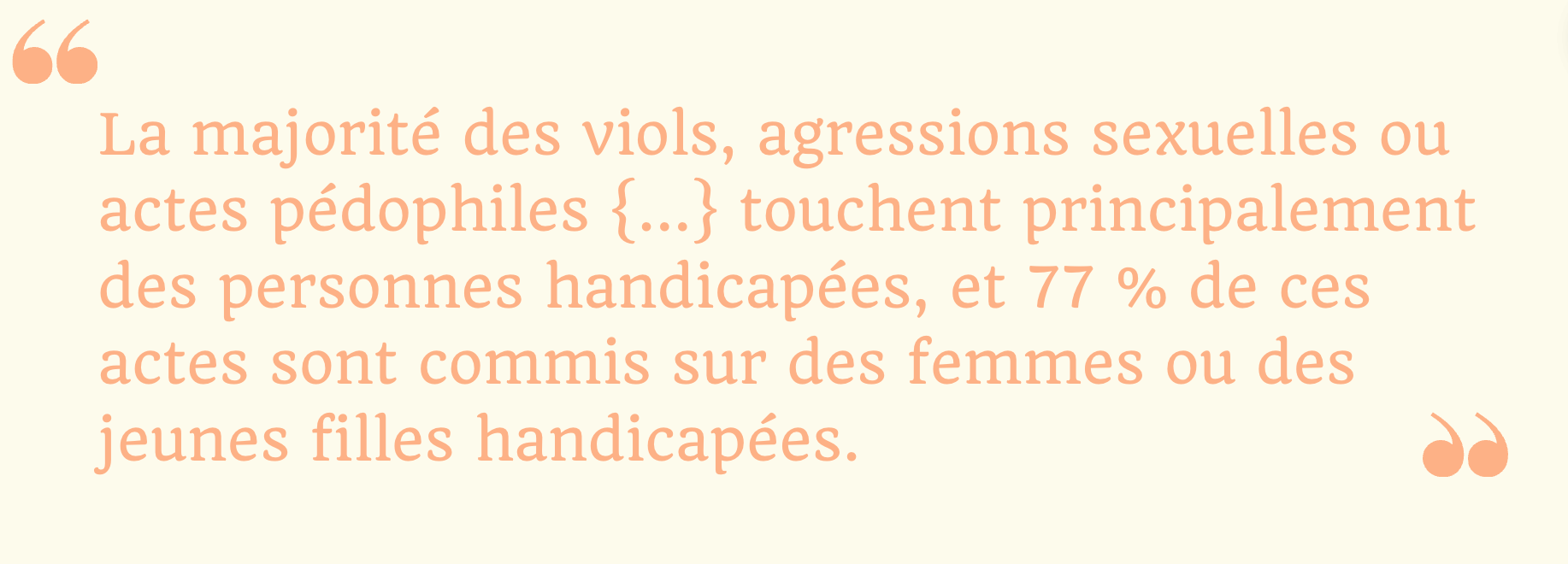 Les discriminations à l’encontre des personnes handicapées sont omniprésentes. La majorité des viols, agressions sexuelles ou actes pédophiles - dont j'ai moi-même été victime - touchent principalement des personnes handicapées, et 77 % de ces actes sont commis sur des femmes ou des jeunes filles handicapées.